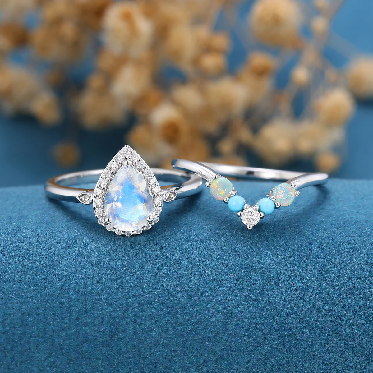 Pear cut Moonstone Halo Engagement ring Bridal Set