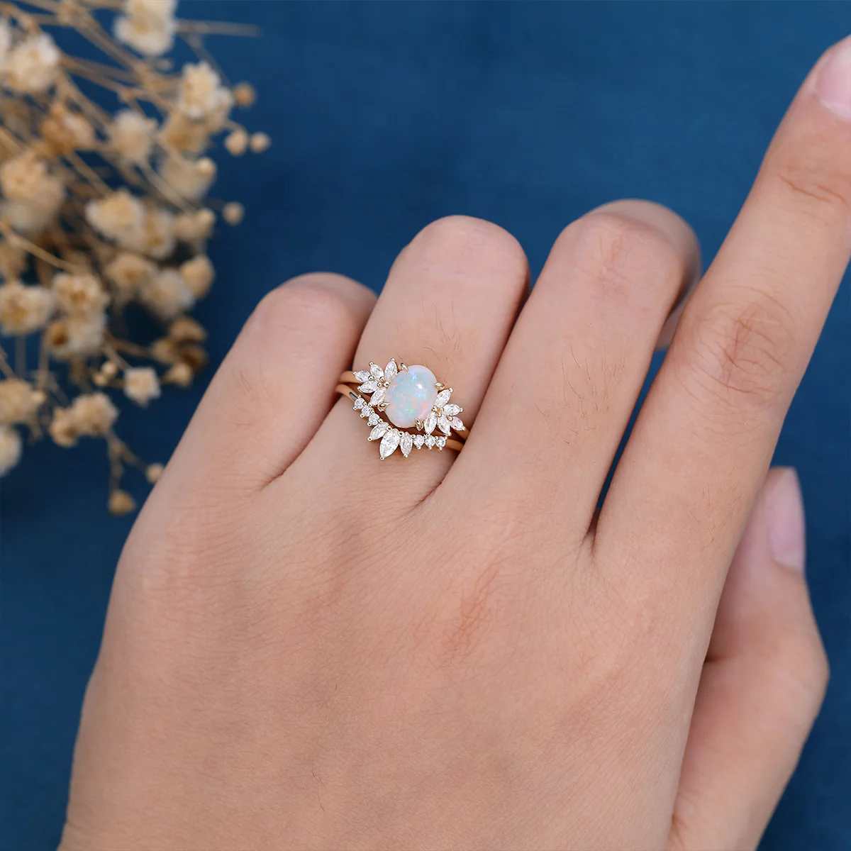 1.0Carat Oval Opal Cluster Engagement Bridal Set