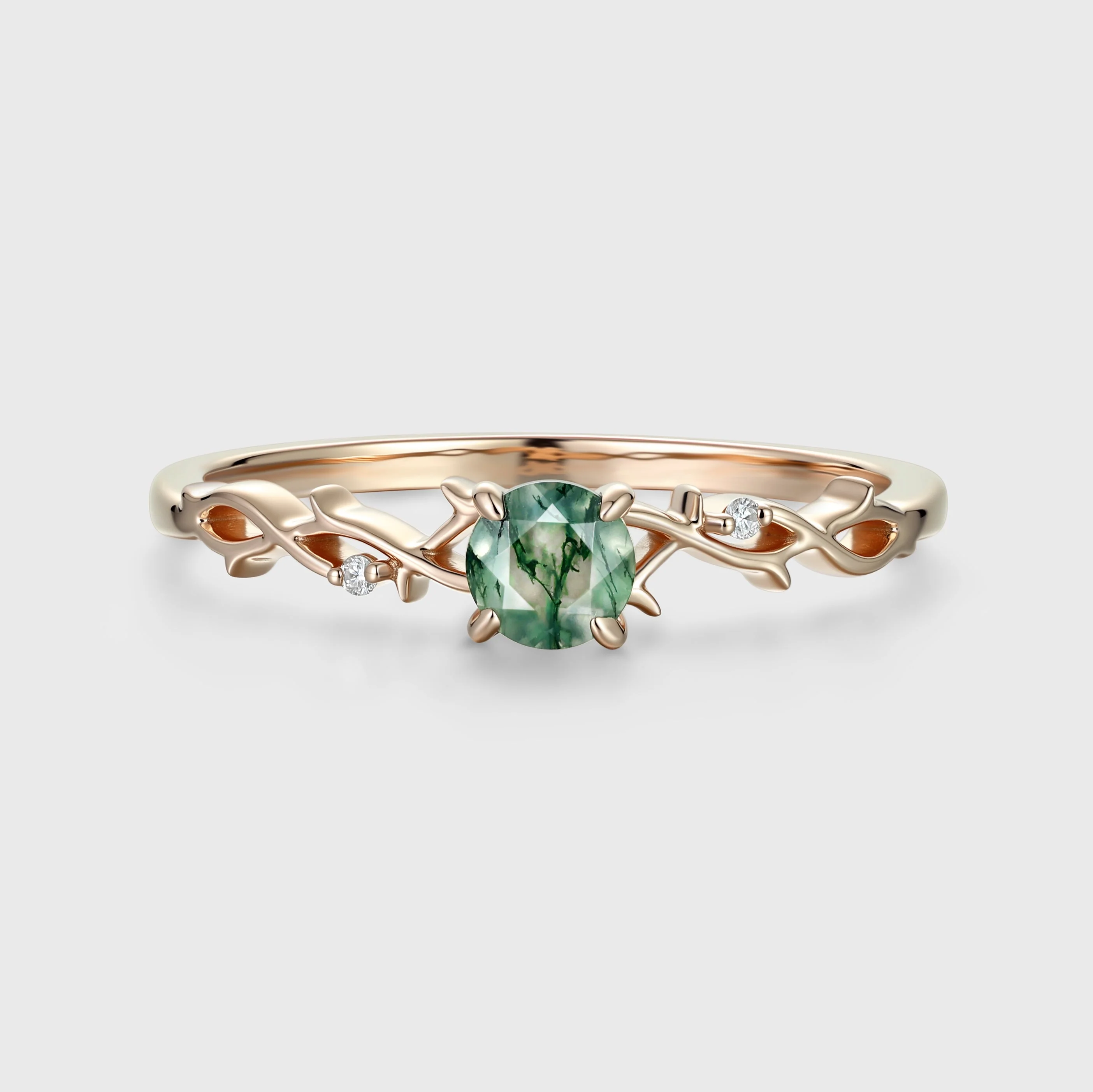 Nature Inspired Round cut Moss Agate + Diamonds twig Engagement Ring