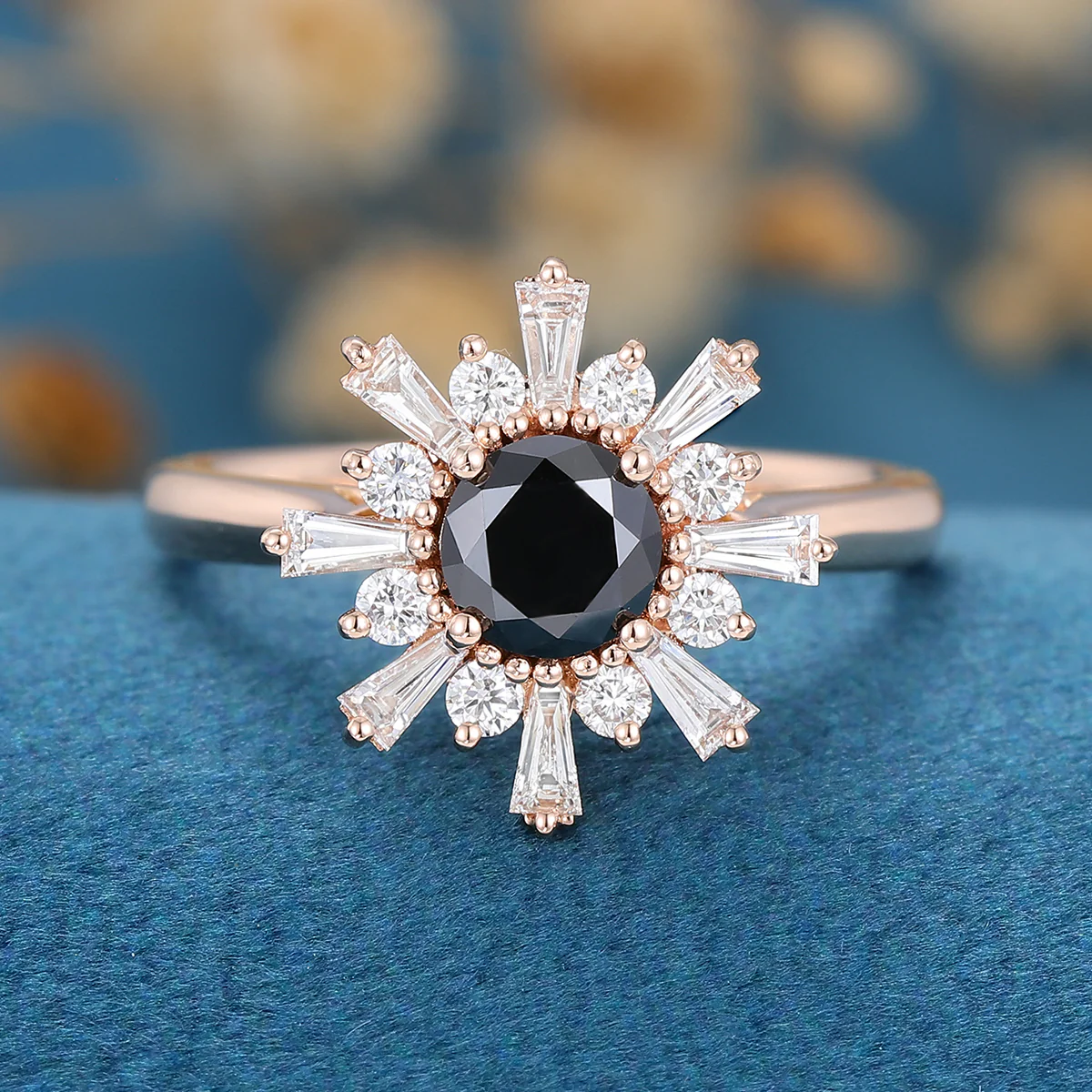 Round Black Onyx | Diamond Flower Baguette Engagement ring