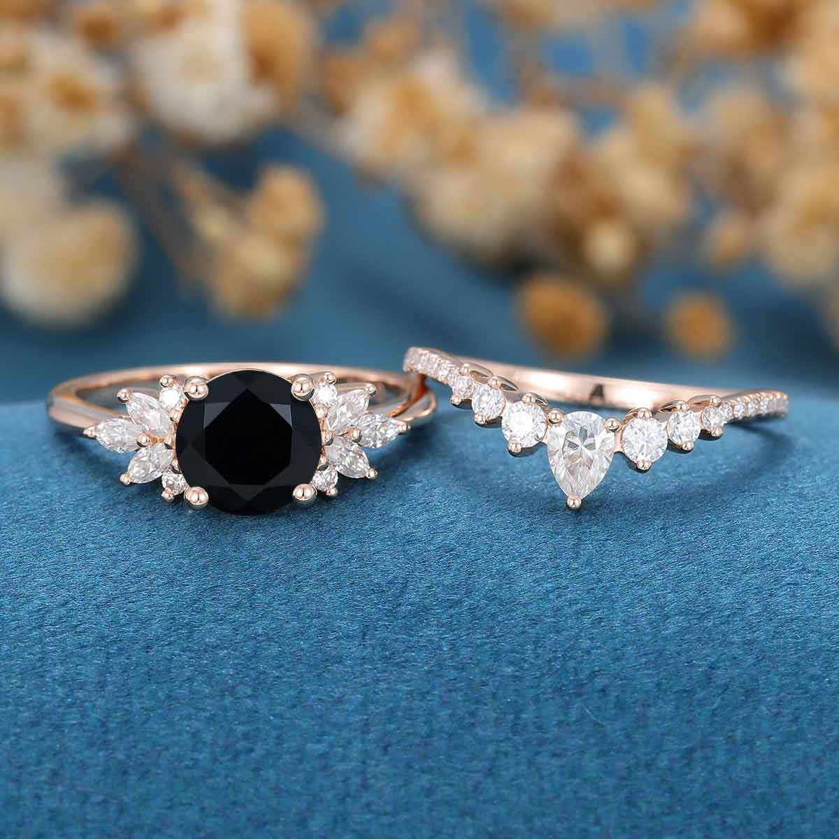 1.2Carat Round Black Onyx Cluster Engagement Bridal Set