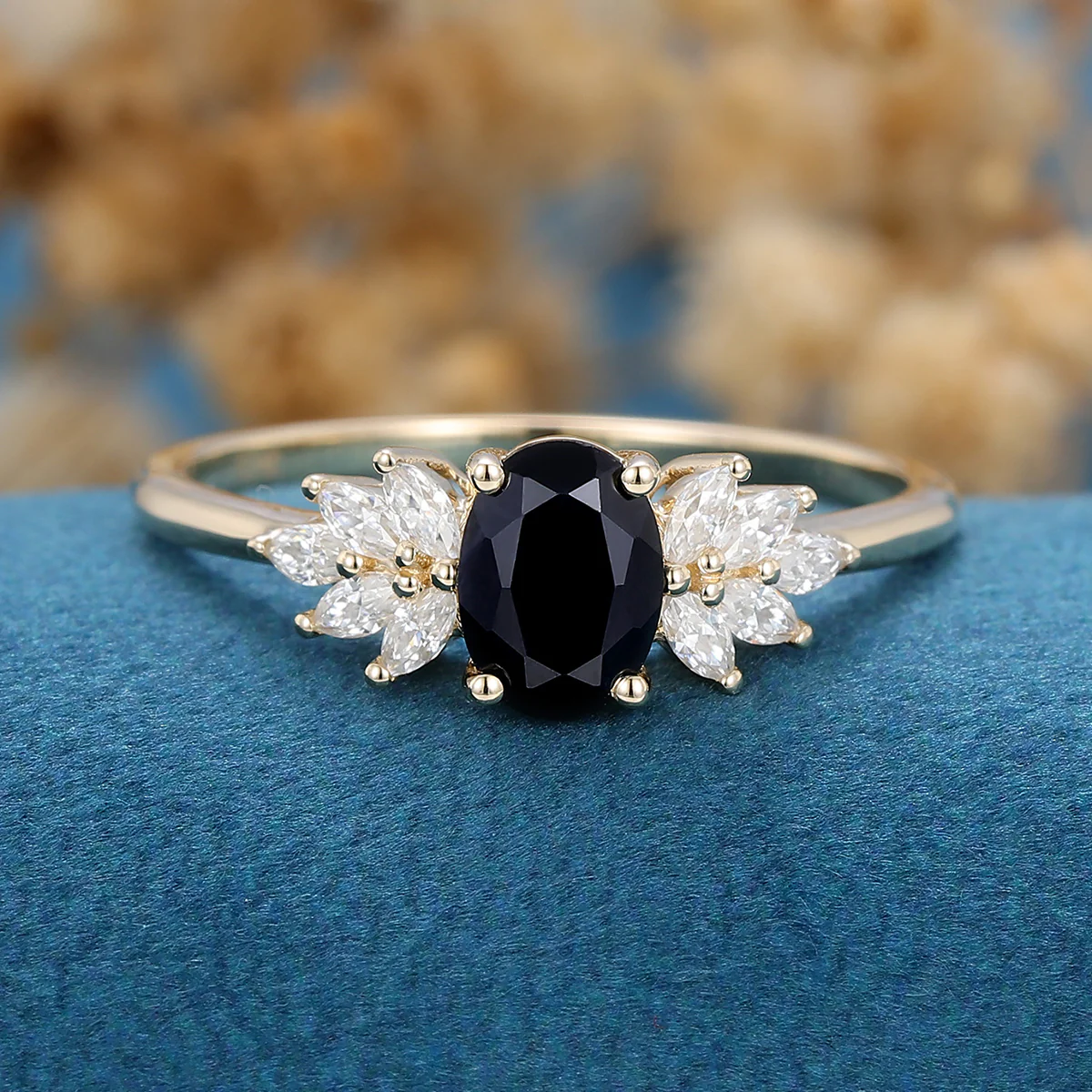 1.0Carat Oval cut Black Onyx Cluster Engagement ring