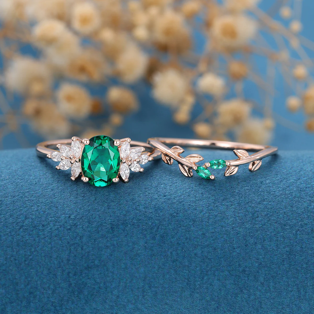Oval cut Emerald Cluster Engagement ring Bridal Set