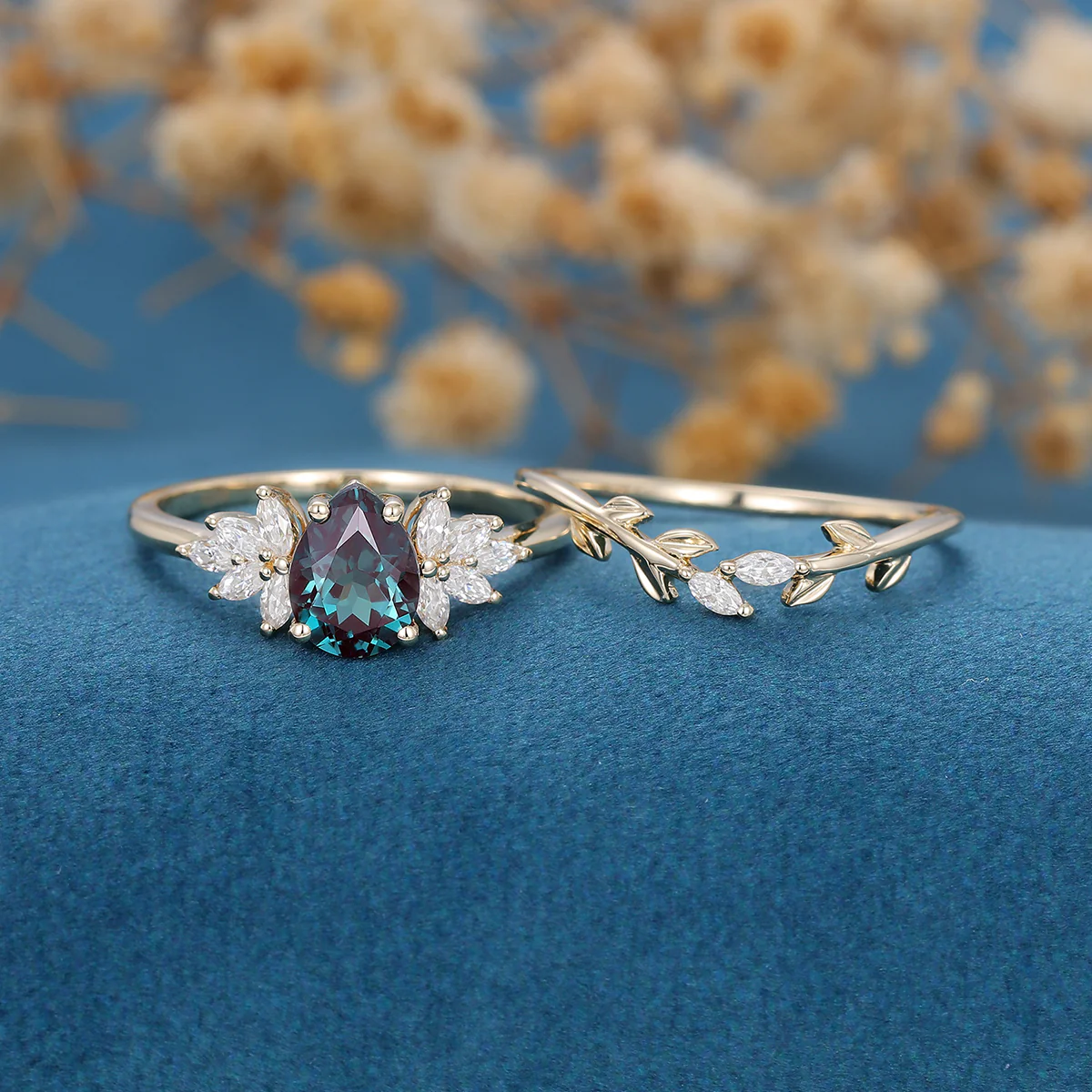 Pear cut Lab Alexandrite Engagement ring Bridal Set